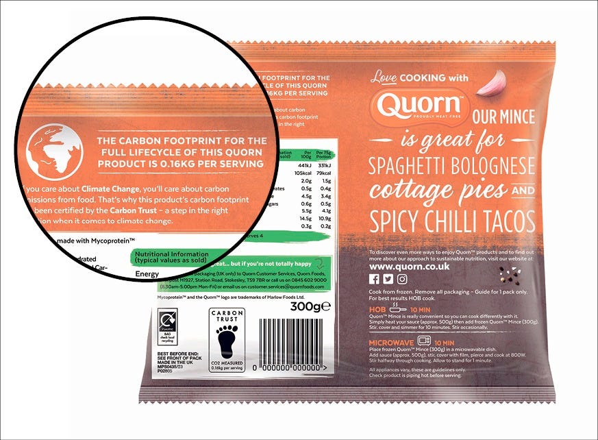 In general, eco-labels struggle to influence behavior because consumers typically fail to understand the information the label is trying to communicate. More often than not, the specific attribute that the eco-label is trying to represent is a term or value that consumers are unfamiliar with. In comparison to the values found on nutrition labels (such as protein, sugar, or calories), things like water usage, greenhouse gas emissions, and regenerative agriculture are less commonplace. Take, for instance, the British meat-alternatives company Quorn, which became one of the first major brands to introduce carbon footprint labeling on its products in 2020. While Quorn’s intent to highlight reduced greenhouse gas emissions is admirable, the actual carbon footprint numerical value (.16 kg per serving) is difficult to interpret. A consumer with no prior knowledge of carbon footprint measurements likely can’t draw any value or conclusions from seeing this type of information on a food package.
